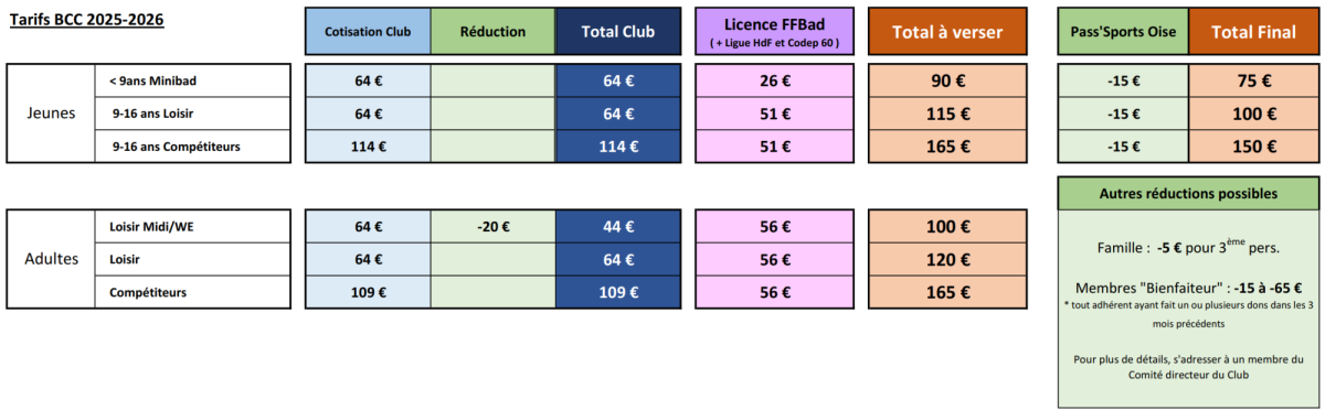 Ci-dessus, retrouvez dans le tableau nos différentes cotisations proposées pour la saison 2025/2026.